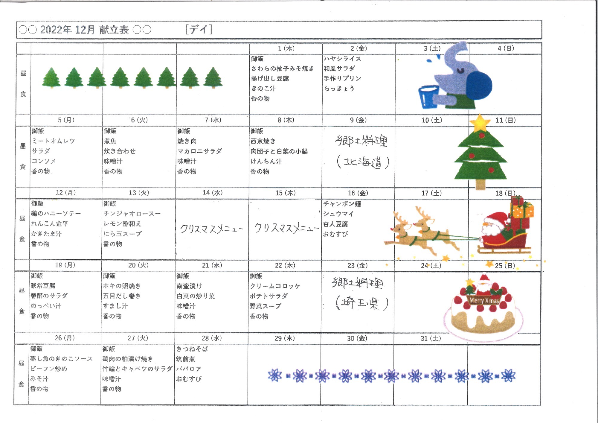 12月献立表になります。今月の特別メニューは下記のとおりです。