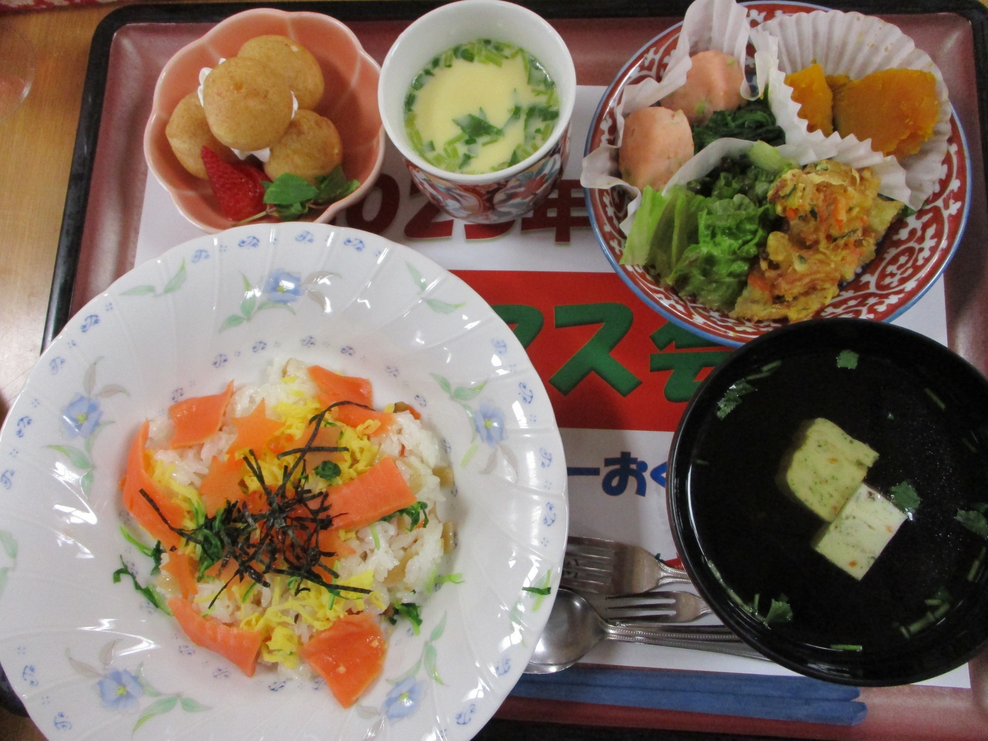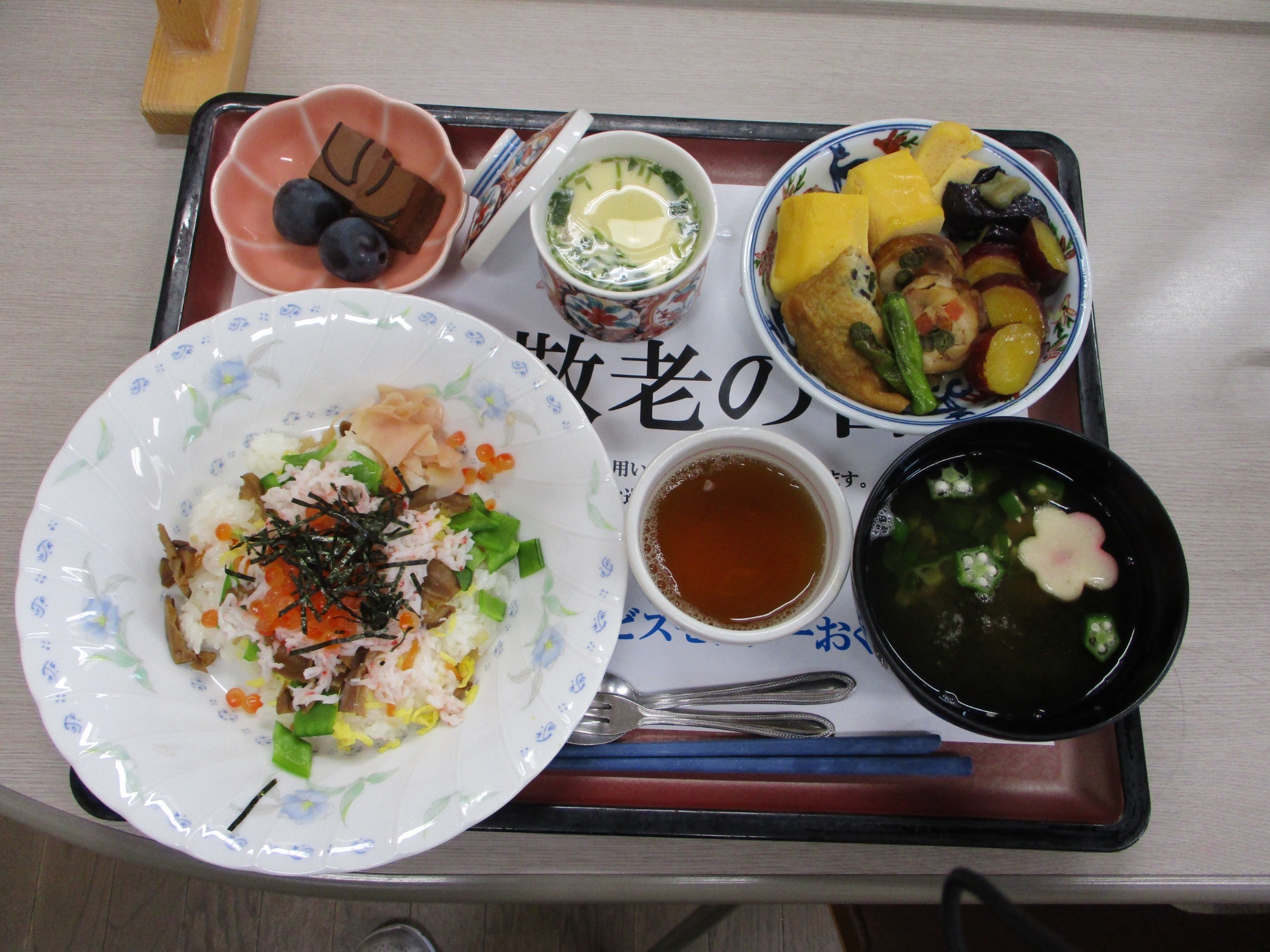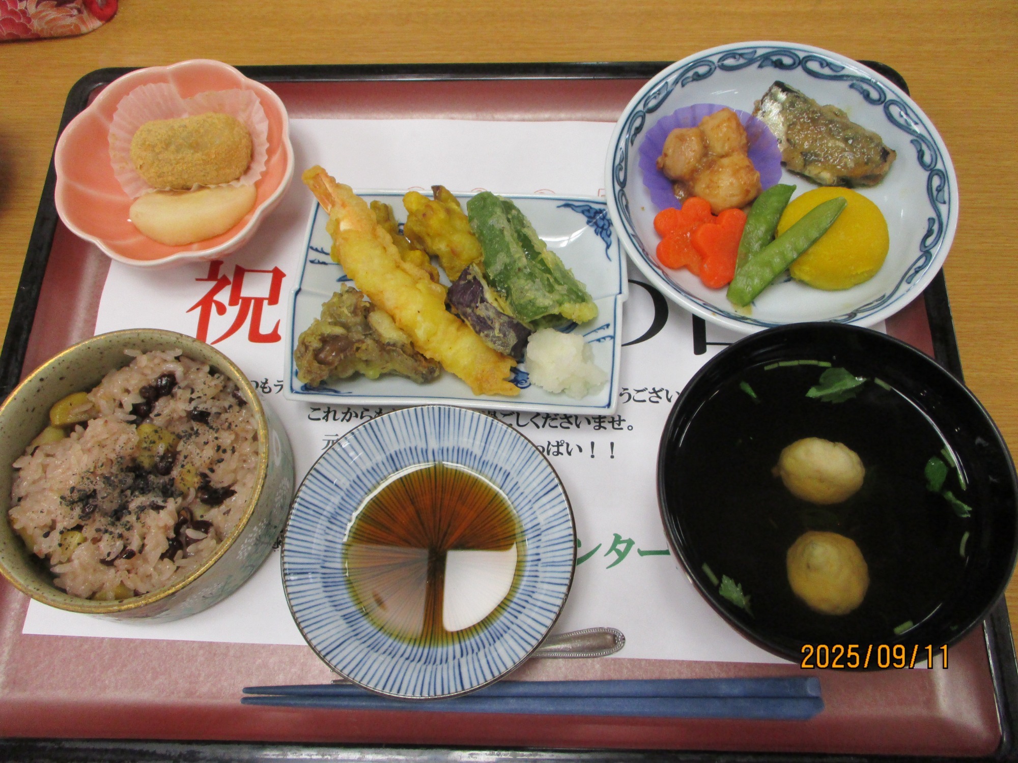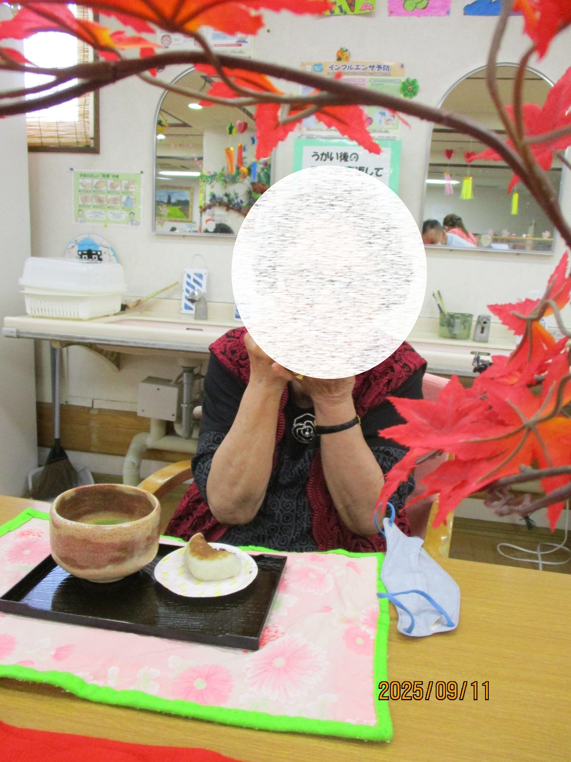 赤飯・ちらし寿司・天ぷら・茶碗蒸し・デザート等もついてきて、とってもおいしい2日間!敬老の日に節目の方は表彰します。その後はお待ちかねのお抹茶とお茶菓子が振舞われます! 今年は焼き饅頭でした! 皆さんお抹茶もおいしいと褒めてくださいました!ありがとうございます♡