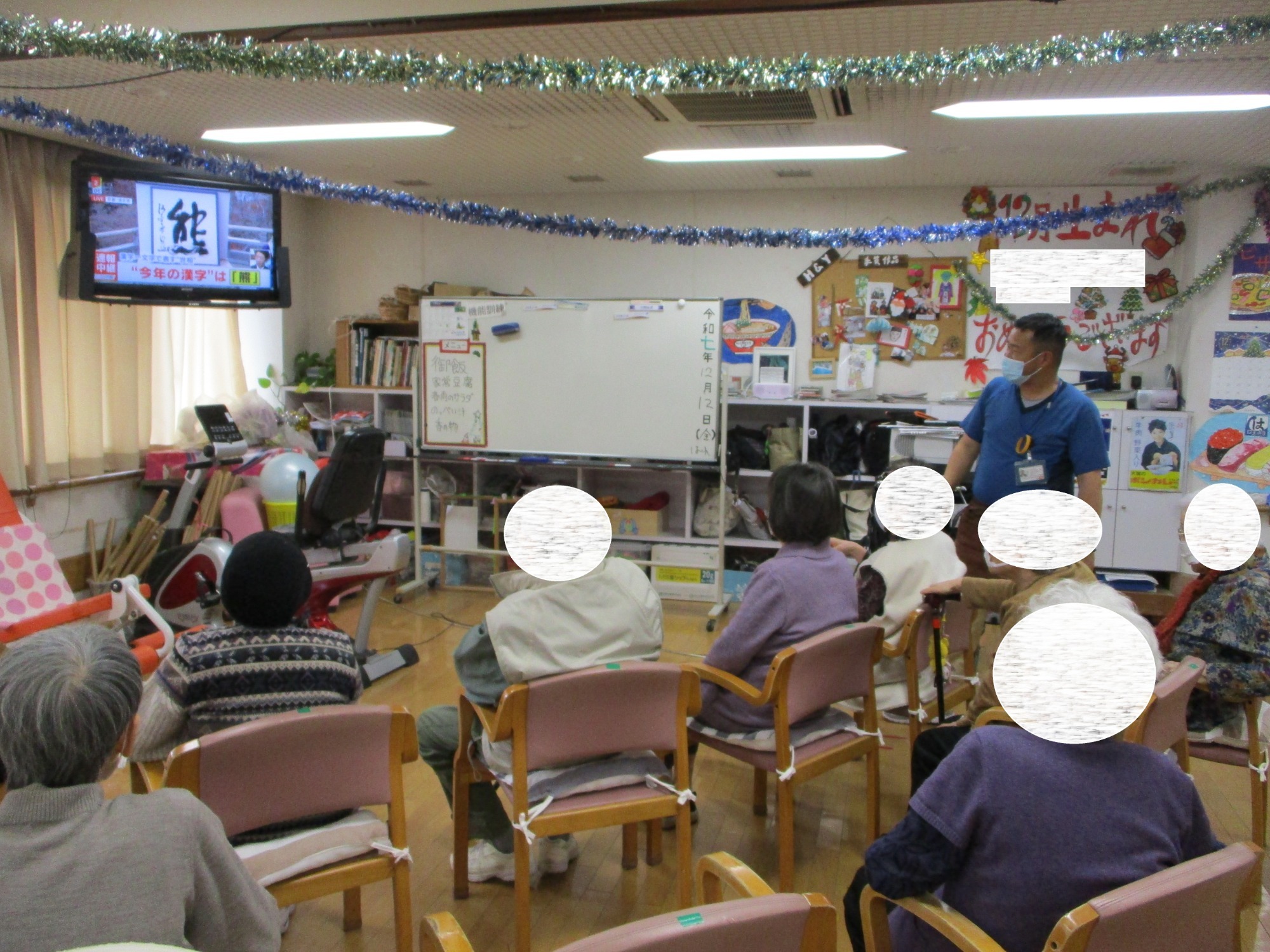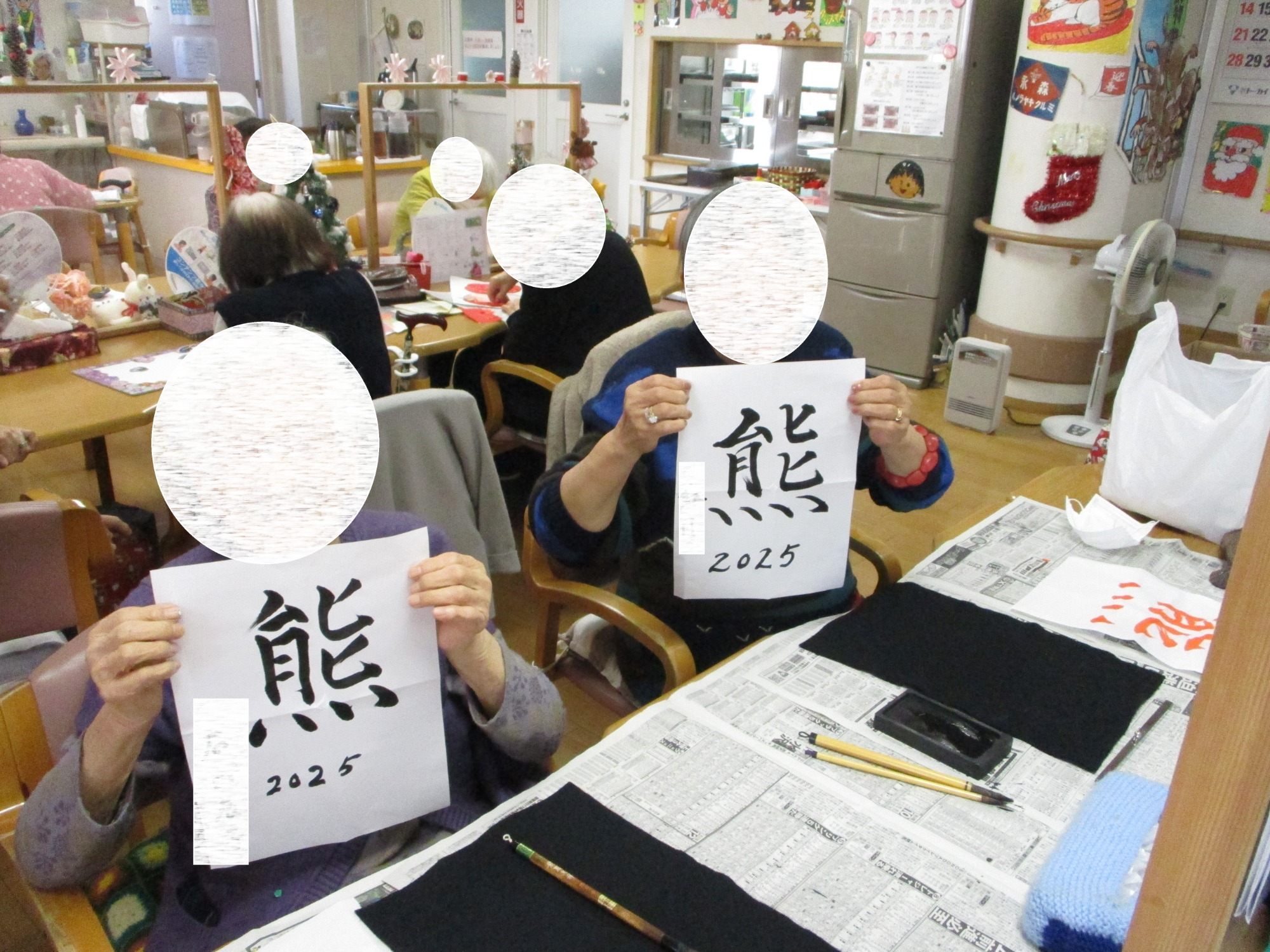 今年の漢字を皆さんご存知ですか? おくだの利用者さんは今年の漢字に興味津々! 今年もテレビにかじりついて見守っていました!「熊」の文字が書かれた時には「やっぱり!」といった感じでした♪ ほかにもクリスマス飾りとして、松ぼっくりを飾ったキャップ飾りを作ったり、今年の漢字を習字で描いたりと、みなさん楽しく過ごされていました!