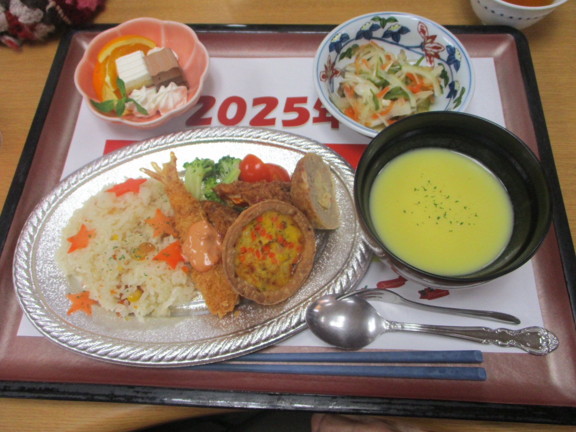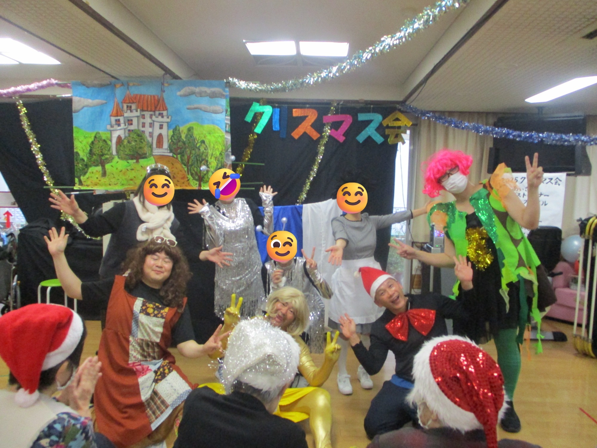 昼食がクリスマスの特別メニューになる他、シャンパンで乾杯を行いました! サンタクロースの恰好でジングルベルを踊ったり~、面白い恰好をして劇を行いました! 今回のおくだクリスマス会の劇は「穴掘りシンデレラ」でした。義理の母・姉にいじめられるシンデレラは金の価値が上がっているからと、金甲山に金を掘りに行くのです・・・といった内容でした(笑)
