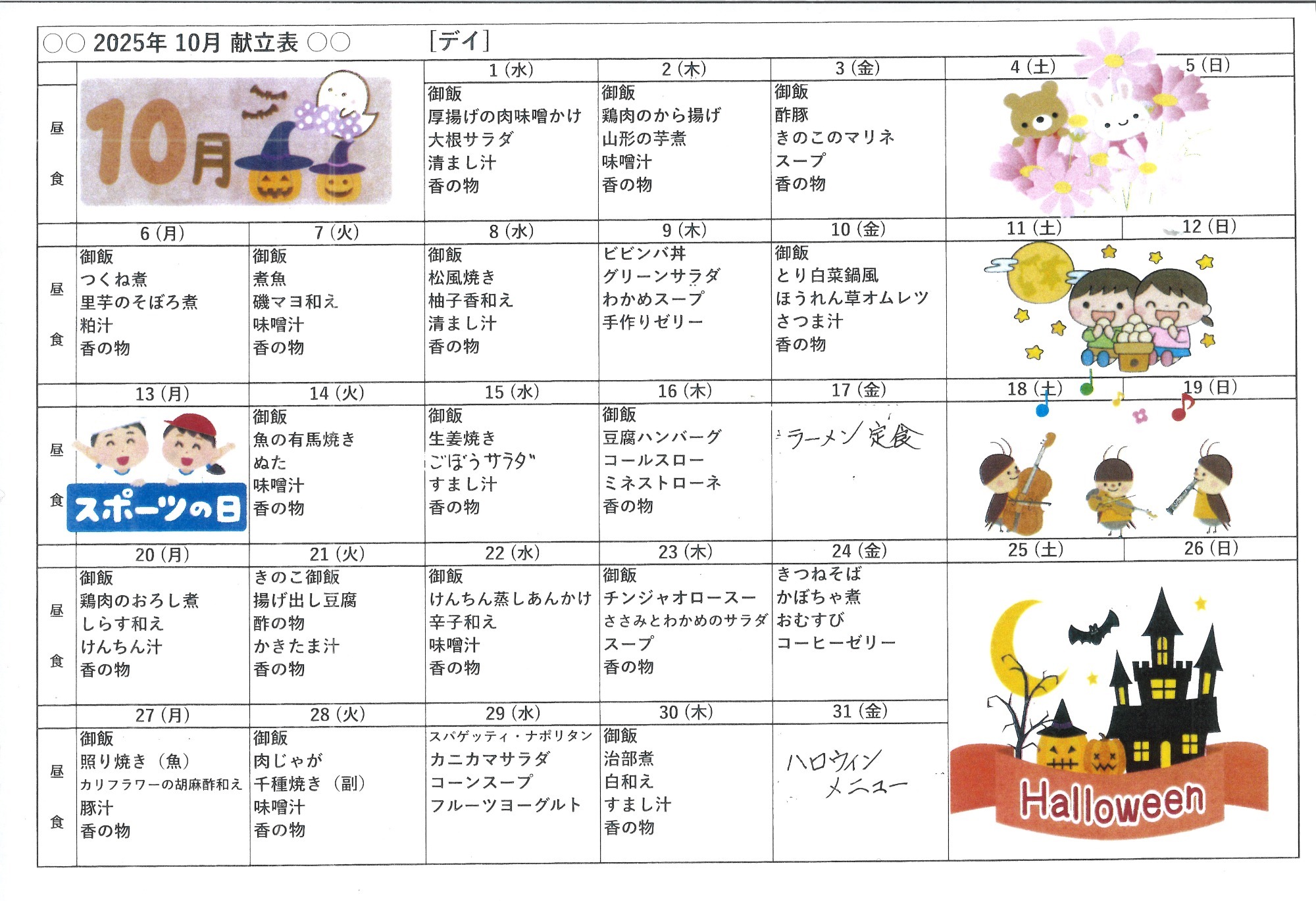 10月献立表になります。今月の特別メニューは下記のとおりです。