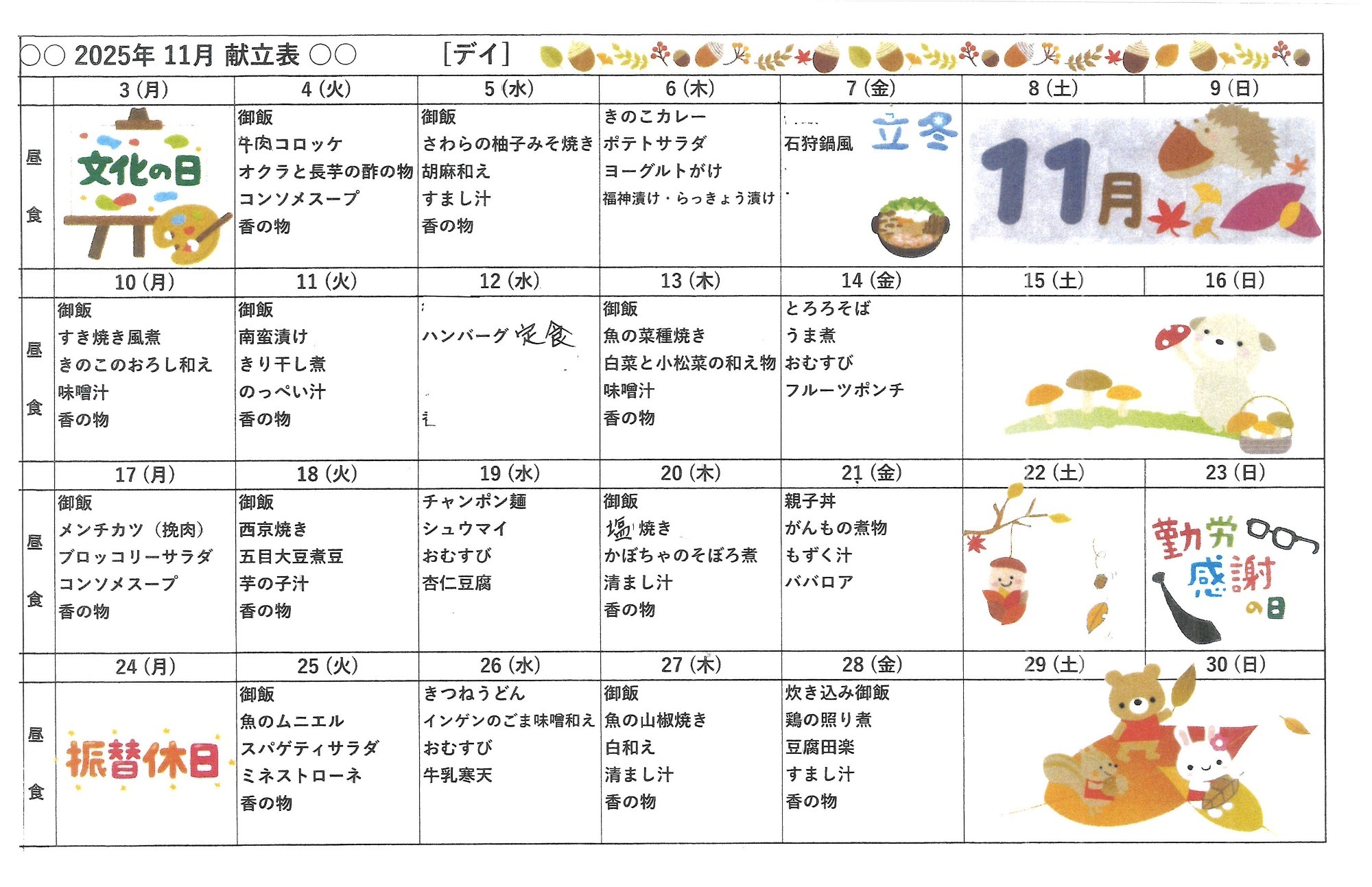 11月献立表になります。今月の特別メニューは下記のとおりです。