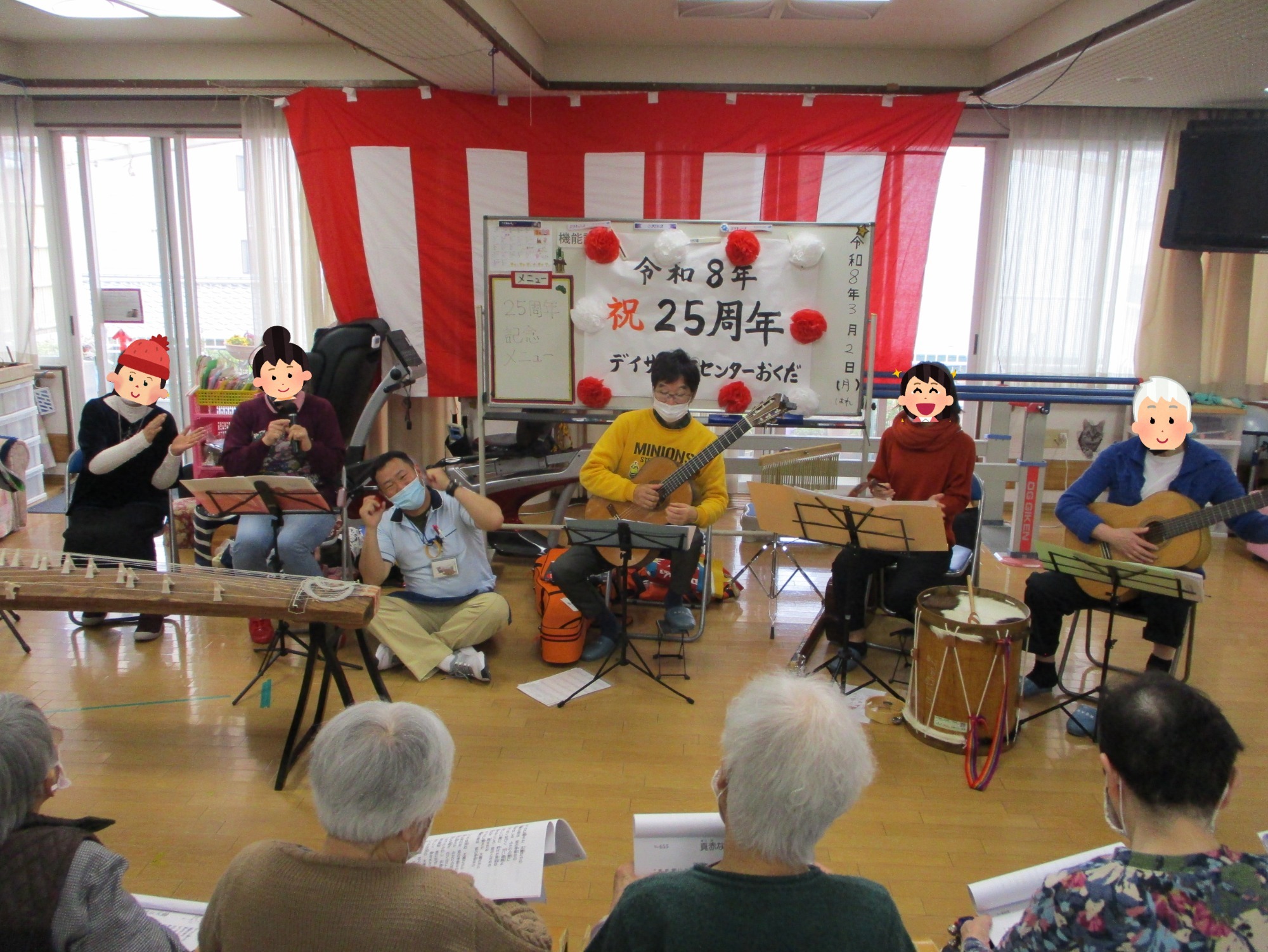 3月1日はおくだにとって特別な日! 開業記念日となります! なんと、なんと、今年で25周年となりました~♬ これもひとえに地域の皆様や利用者の皆様のおかげでございます! おくだの周年記念イベントでは今回もゲストの方をお呼びしまして、演奏会を実施していただきました! 「内堀ギター教室」の皆様による特別演奏会! ご利用者の皆さんも喜んでくださいました! また、それに合わせて25周年記念メニューのご馳走が出ました!